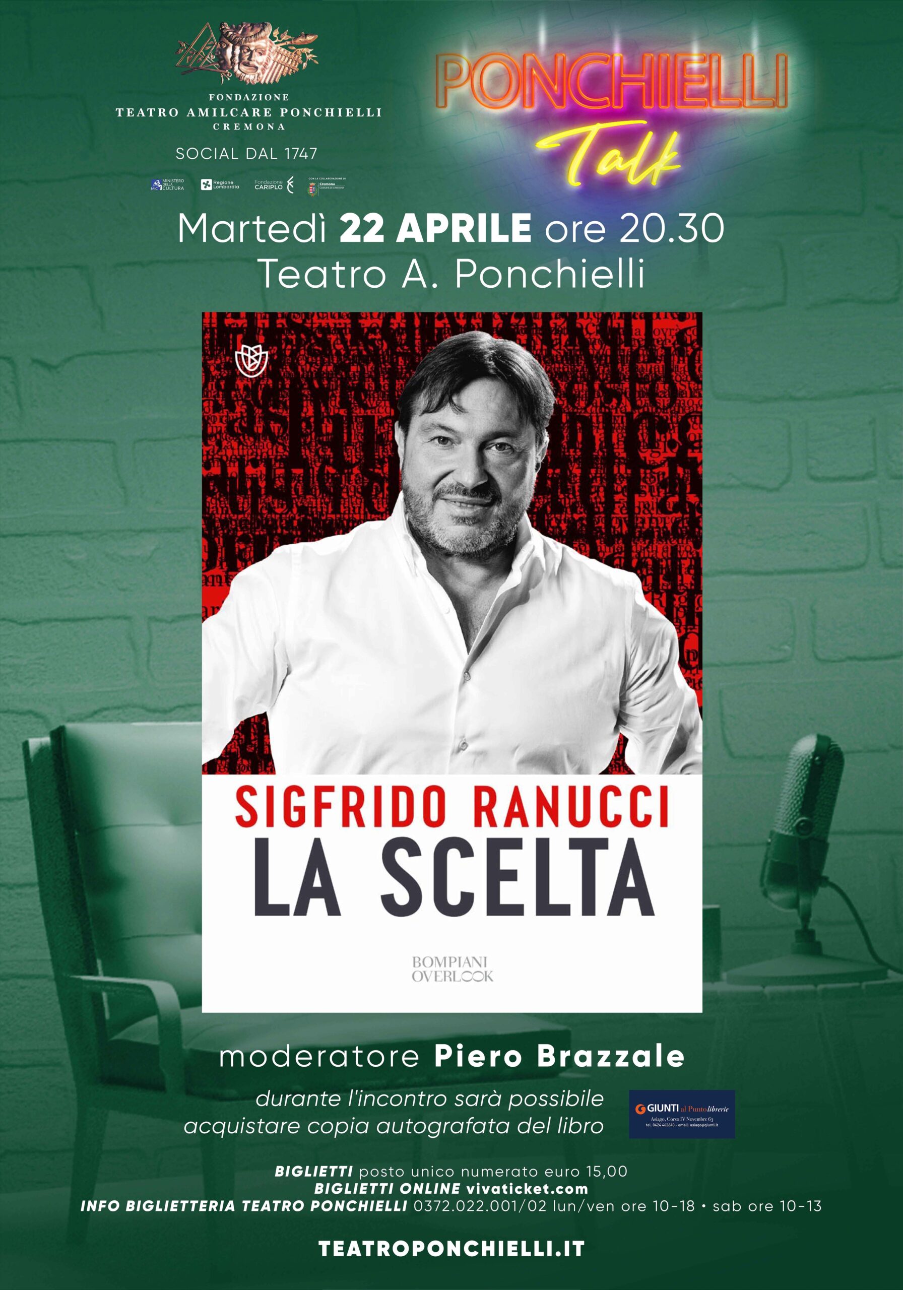Un nuovo appuntamento di PONCHIELLI Talk, format di scoperta e approfondimento con personalità del mondo della cultura, è fissato per martedì 22 APRILE (ore 20.30) e vedrà protagonista SIGFRIDO RANUCCI, giornalista, autore, conduttore televisivo e volto del programma d’inchiesta Report che affronterà tematiche sul giornalismo d’inchiesta e presenti nel suo nuovo libro La Scelta (Ed. Bompiani)