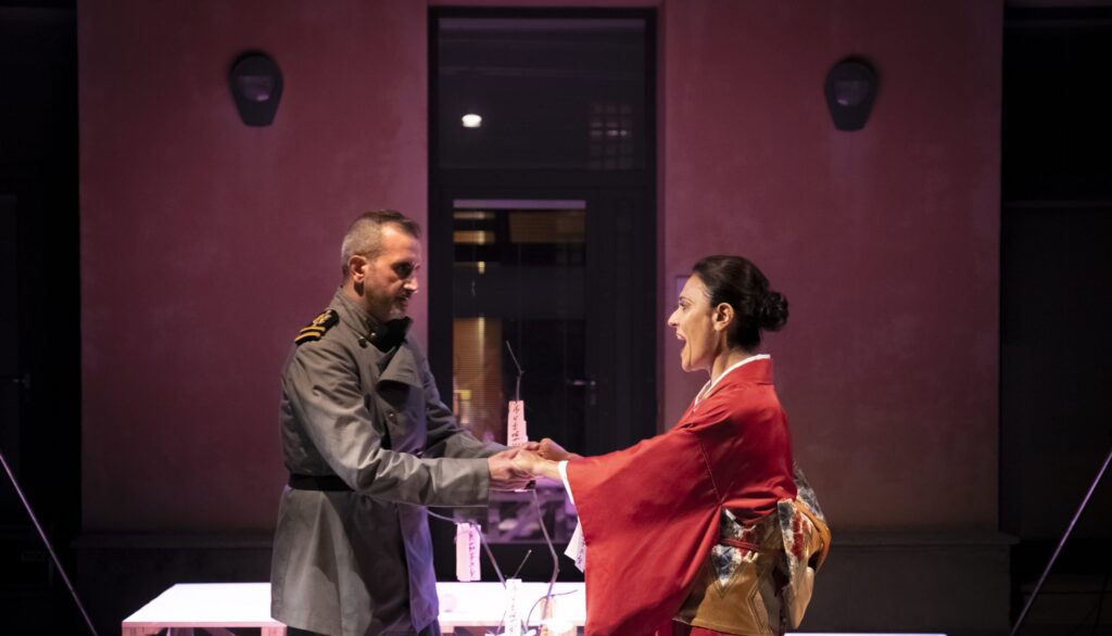 Lo spettacolo si apre con la presentazione dei personaggi in uno spazio “cosmico” ben distinto, il Tatami, che al pari di una composizione di ikebana, rappresenta i tre livelli: il cielo, il più alto, la terra il più basso e l’uomo il livello intermedio. Questi tre livelli, queste tre forze, si devono armonizzare per creare l’universo. Come dice Sharpless è un facile vangelo…, ma una delle forze che concorre all’armonizzazione dell’universo è l’uomo e per sua natura tende a intaccarne l’armonia. Da un lato Butterfly si muove in questo spazio accogliendo l’amore dell’uomo che spera le cambierà la vita e i suoi piccoli gesti ne attenderanno il ritorno, dall’altra Pinkerton che con le sue lusinghe non risparmierà di recidere quel fiore per assecondare le sue voglie e i suoi personali obiettivi. Saranno Sharpless e Suzuki a tentare, invano in questo spazio rappresentativo, di armonizzare il cosmo.